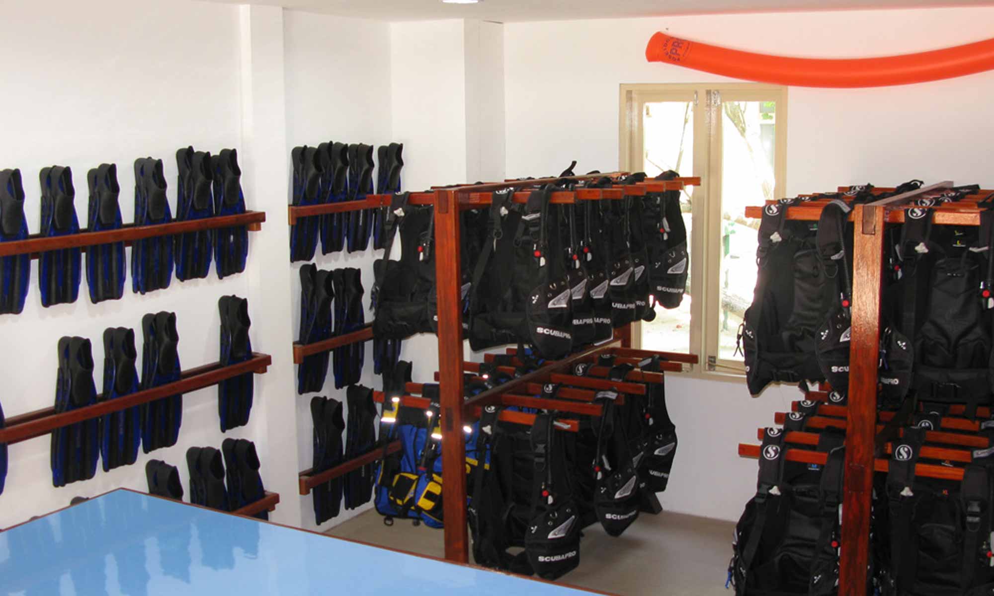 Die sehr gut ausgestattete Basis zählt zu den besten Adressen auf den Malediven und verfügt über einen großzügigen offenen Empfangsbereich mit Check-In Schalter, eine Werkstatt und einem abschließbaren Raum für Gästeequipment. Die leistungsstarke Füllstation mit zwei Kompressoren und einer Nitroxanlage sorgt für beste Luftqualität. Umfangreiches Leihequipment (60 komplette Scubapro-Sets auf neuestem Stand, 100 ABC-Schnorchelausrüstungen) sowie 120 12-Liter Alu-Flaschen mit DIN- und INT-Anschlüssen werden angeboten.